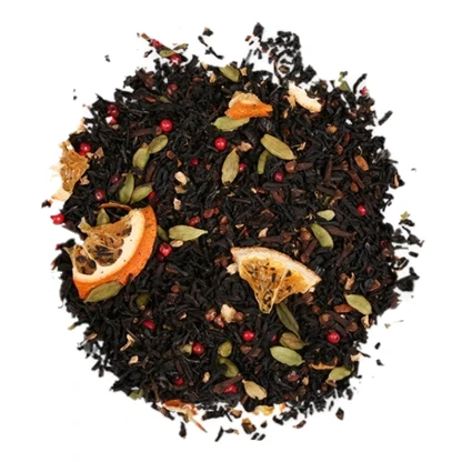 Té negro Ceylán 74%, Naranja, Canela, Jengibre, Clavo, Pimienta Rosa, Cardamomo, Vainilla y aromas.